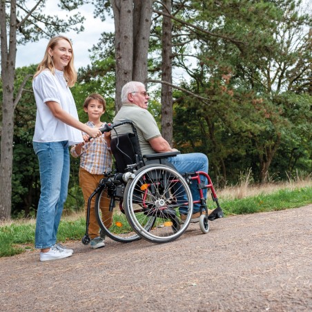 Motorisation légère et amovible fabriquée et installée en France. C'est une aide à la poussée et au freinage destinée à la tierce-personne. Compatible avec la plupart des fauteuils manuels pliants, fixes et confort (consulter le guide de compatibilité). Conduite via des poignées de commande Système d'embrayage ergonomique. Large choix de couleurs. Vitesse max. : 6km/h programmable. Autonomie: jusqu'à 12 km (avec la batterie Li-ion 11,4 Ah). Poids utilisateur jusqu'à 125 kg.