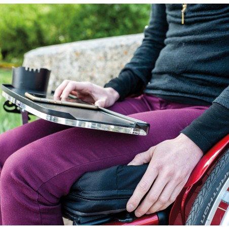 Tablette légère et amovible fabriquée en France. S'adapte à tous les fauteuils manuels et électriques (nous consulter). Tablette réglable qui se positionne sur les genoux pour faciliter vos gestes du quotidien. Peut être facilement rabattable pour faciliter les transferts. Disponible en taille standard, mini ou large.