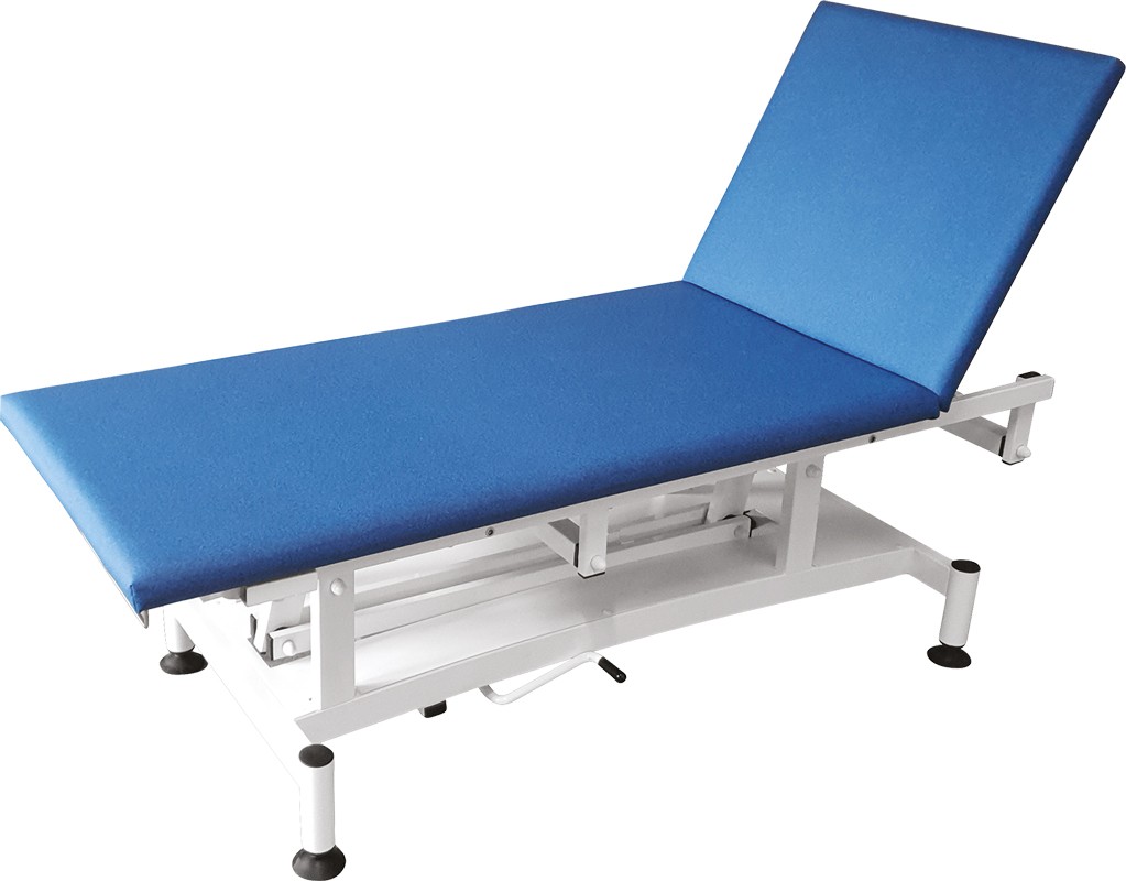 Hauteur variable électrique. Déplacement vers l'avant 20 cm. Dossier réglable par vérin à gaz, 4 patins noirs réglables en polyamide, porte-rouleau, commande au pied. Bâti en tube rectangulaire époxy blanc. Sellerie cousue 4 cm, mousse assise et dossier densité 28 kg/m³. Carter de protection au niveau du piétement. Dim. hors tout L 200 x l 67 ou 80 x H 58-96 cm. Poids max. : 300 kg. Plusieurs options disponibles. Garantie : 3 ans, hors sellerie.