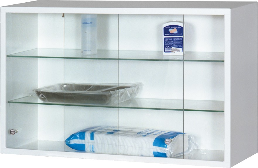 Corps en tôle époxy blanc. 2 portes vitrées coulissantes et de 2 étagères en verre. Dim. L 100 x H 50 x P 25 cm. Poids de l'armoire : 20 kg. Pption : système de fermeture à clef. Garantie : 3 ans.