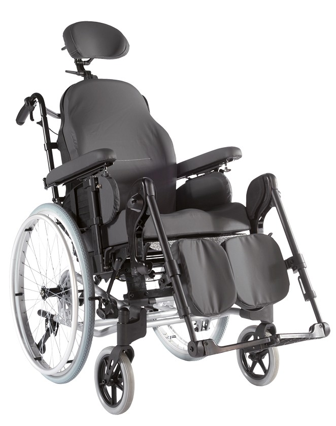 Fauteuil confort robuste. De série : appui-tête confort, dossier et coussin confort anatomique, repose-jambes avec coussinet confort et protection de genoux. Assise et dossier inclinables par vérins à gaz. Poignées de poussée et accoudoirs réglables en hauteur. 3 largeurs d’assise : 41 à 51 cm. Profondeur d’assise : 42 cm (42-50 cm). Hauteur d’assise : 47,5 cm (45-50 cm). Poids : à partir de 34 kg. Poids max. : 145 kg. En option : gouttière hémiplégique. Garantie : 2 ans. Crash testé.